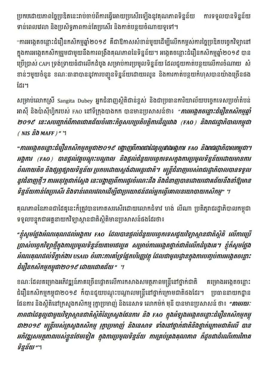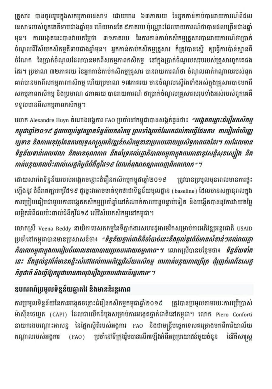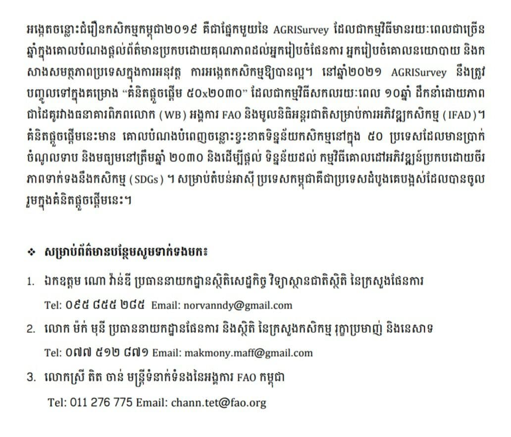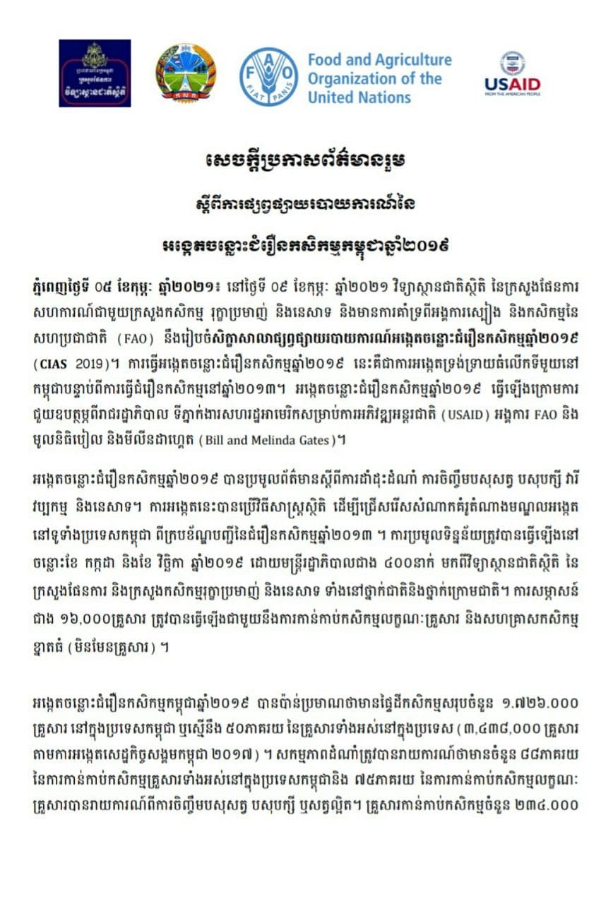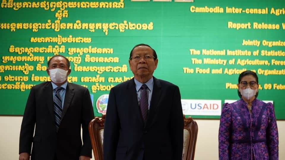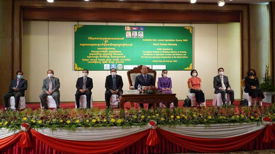 ពិធីប្រកាសផ្សព្វផ្សាយលទ្ធផលអង្កេតចន្លោះជំរឿនកសិកម្មកម្ពុជាឆ្នាំ២០១៩ ក្រោមអធិបតីភាពដ៏ខ្ពង់ខ្ពស់របស់ ឯកឧត្តម កិត្តិសេដ្ឋាបណ្ឌិត ឆាយ ថន ទេសរដ្ឋមន្រ្តី រដ្ឋមន្ត្រី ក្រសួងផែនការ នាព្រឹកថ្ងៃអង្គារ ១២រោច ខែមាឃ ឆ្នាំជូត ទោស័ក ព.ស២៥៦៤ ត្រូវនឹងថ្ងៃទី៩ ខែកុម្ភៈ ឆ្នាំ២០២១ នៅសណ្ឋាគារភ្នំពេញ ។