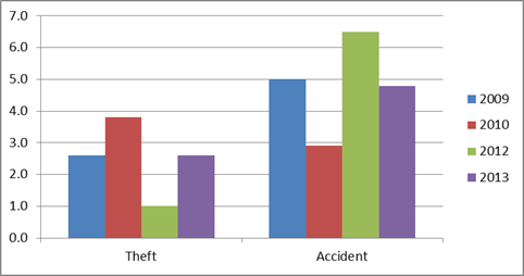 Figure 1. Households with at least one victimized household member. By theft and accident. Percent.